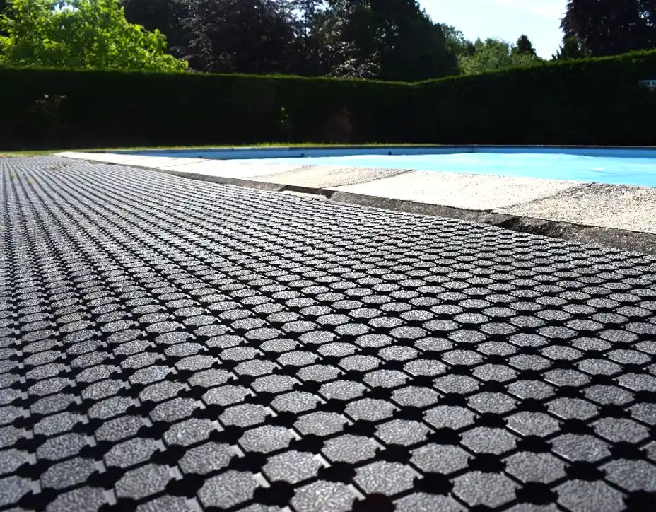 - Series o crossed linked rings in the mat protects the lawn and grassed area from becoming boggy.